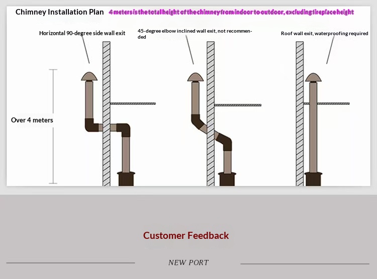 - Height Requirements: As shown in the provided chimney installation plan, the height of the smoke pipe is a critical factor. Generally, the total height of the chimney (from indoor to outdoor, excluding fireplace height) should be at least 4 meters. This height helps create a proper draft, ensuring that the smoke is effectively drawn out. However, local building codes and regulations may have specific height requirements, so it’s essential to check and comply with them.Smoke Pipes of Fireplaces
